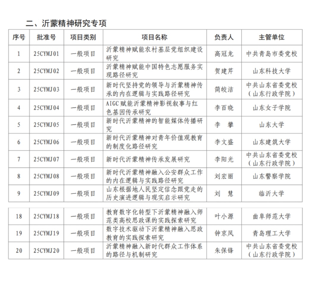 近日,2025年度山东省社科规划研究专项立项名单正式公示,中心支部成员钟京凤副教授主持的《数字技术驱动下沂蒙精神融入思政教育的实践探索研究》(项目编号:25CYMJ19)成功入选沂蒙精神研究专项。