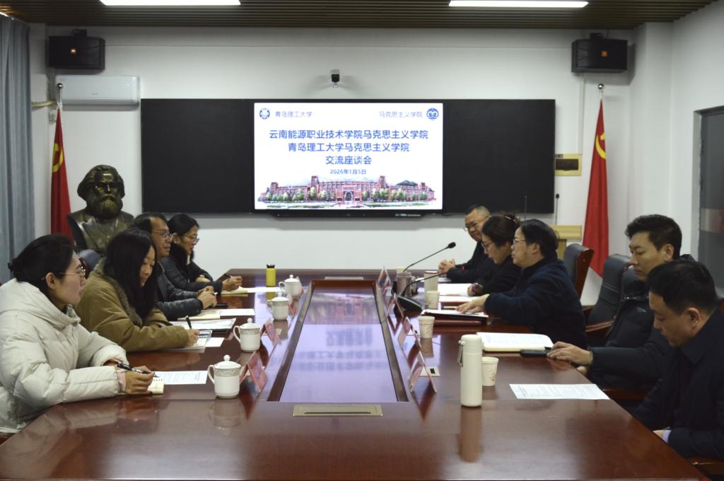 1月5日上午,云南能源职业技术学院马克思主义学院党总支书记、院长邓祖波,党总支副书记、副院长徐跃宏,党总支宣传统战委员、形势与政策教研室主任艾静,中华民族共同体概论课教研室主任孙昊一行4人,莅临青岛理工大学马克思主义学院开展合作交流。此次座谈会于主教学楼A310会议室举行,青岛理工大学马克思主义学院院长华章琳、院长助理王鹏、“大思政课”实践中心主任李晓辉、形势与政策教研室主任化磊参会。会议由学院党委副书记兼副院长石峰主持。