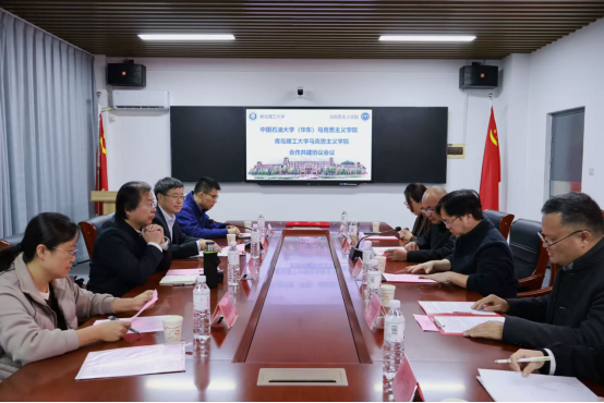 为深入贯彻习近平总书记关于教育的重要论述特别是学校思政课教师座谈会精神,贯彻落实中办、国办《关于深化新时代学校思想政治理论课改革创新的若干意见》(中办发〔2019〕47号)和《山东省深化新时代学校思想政治理论课改革创新行动方案》(鲁教组字〔2020〕1号)、《中国石油大学(华东)与青岛理工大学战略合作协议》要求,实现协同发展、合作提升。10月22日下午,中国石油大学(华东)马克思主义学院党委书记姚成郡、院长张瑞涛、副院长崔军伟、党委副书记李宝玺一行4人,莅临青岛理工大学马克思主义学院开展合作交流。此次座谈会于主教学楼A310会议室举行,青岛理工大学党委常委、统战部部长、马克思主义学院党委书记陈伟,院长华章琳、党委副书记兼副院长石峰、兼职组织员李璐参会。合作共建活动由马克思主义学院副院长李龙强主持。
