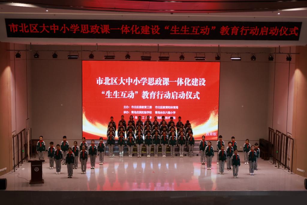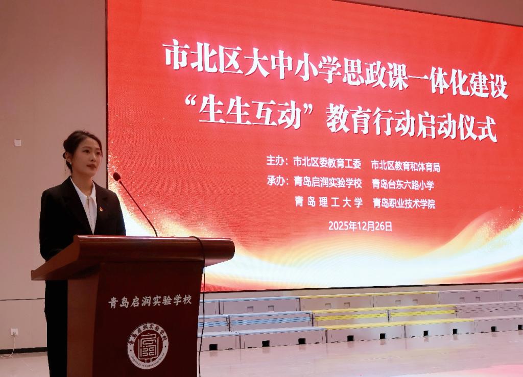 为切实整合青岛市各学段思政教育优质资源,深入推进我市大中小学思想政治教育一体化建设,12月26日下午,青岛理工大学马克思主义学院协同青岛职业技术学院、青岛启润实验学校、青岛台东六路小学,在市北区教育和体育局的精心组织下,共同举办了市北区大中小学思政课一体化建设“生生互动”教育行动启动仪式。青岛市教育局思想政治与德育工作处二级调研员孙建中,市北区教育和体育局党组成员、副局长翟春燕,青岛理工大学马克思主义学院院长华章琳、院长助理王鹏,青岛职业技术学院马克思主义学院副院长王洪娇等有关部门领导出席本次活动。